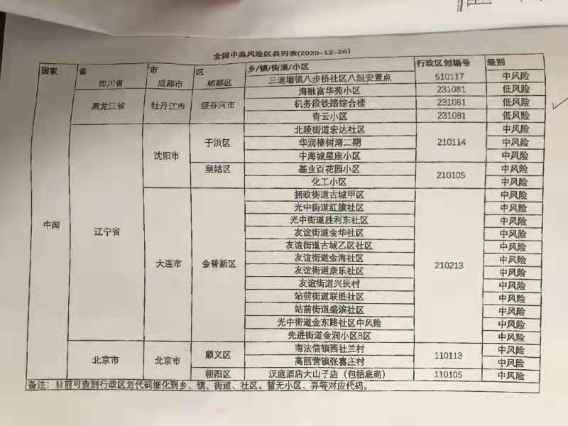现将上级疫情防控指挥部公布12月28日版中高风险区县列表下发,请各单位、部门严格排查,一经发现,马上采取相关管控措施,并报学校教职工疫情防控组。