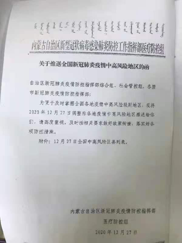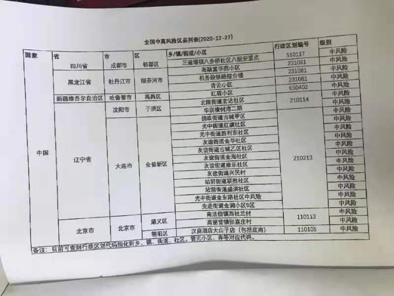 转发“关于推送全国新冠肺炎疫情中高风险地区的函”(12月27日)