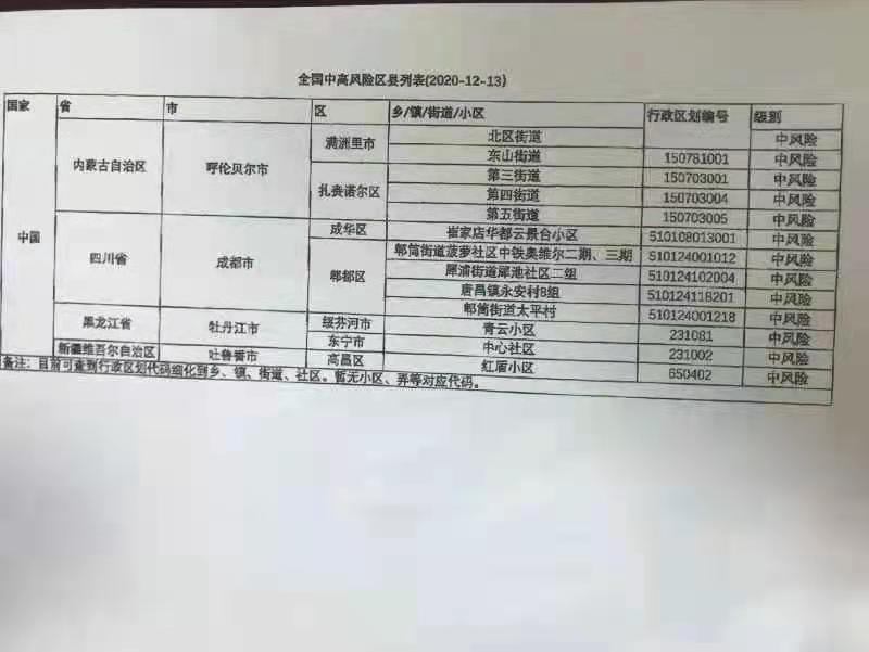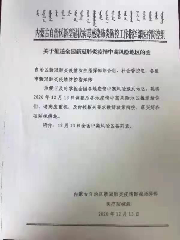 转发“关于推送全国新冠肺炎疫情中高风险地区的函”(12月13日)